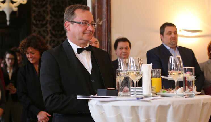Bei unserer Abschiedsfeier in der Bel-Etage des Café Landtmann wurde unser Herr Herbert vom Arbeiterkammer Präsident Rudolf Kaske persönlich mit einer Urkunde geehrt und erhielt vom Wirtschaftskammer-Fachgruppenobmann, Wolfgang Binder, eine goldene Mitarbeitermedaille für den "Dienst am Gast", den Herr Herbert als "Botschafter für den Kellnerberuf" auf herausragende Art und Weise geleistet hat.