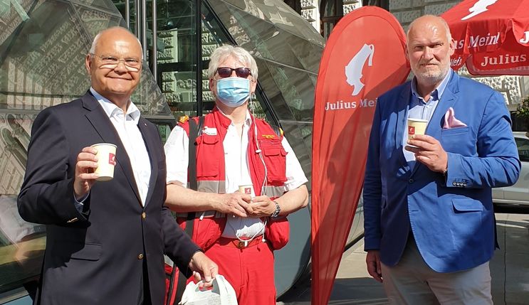 Familie Querfeld und Julius Meinl bedankten sich gestern auf der Terrasse des Café Landtmann bei den Wiener Einsatzkräften mit einer Einladung auf Kaffee und Kuchen. Rund 50 Mitarbeiterinnen und Mitarbeiter vom Roten Kreuz, Samariterbund, Maltesern, Feuerwehr Wien und Polizei Wien waren die Ersten, die sich über Melange & Co sowie Landtmann’s Original Torten zum Mitnehmen freuten.